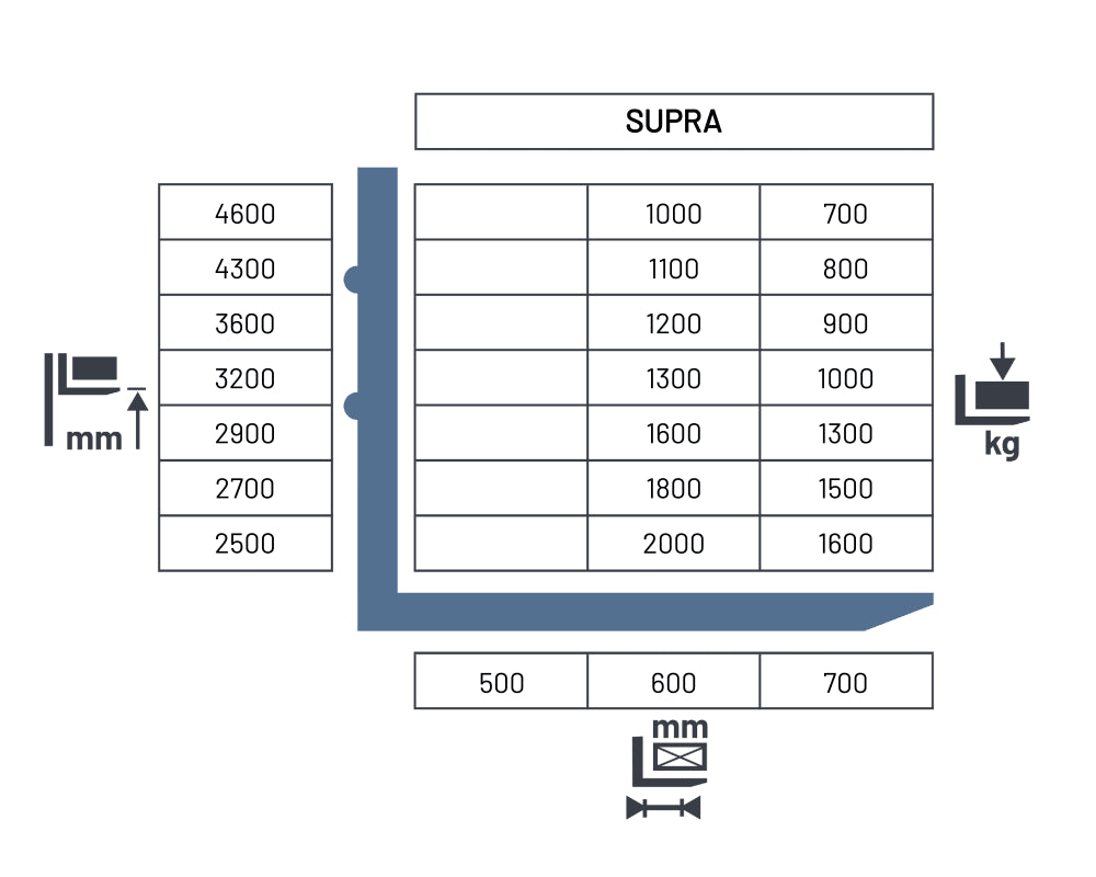 Our SUPRA is a powerful electric reach stacker for storing and retrieving goods in high rack levels. The precise motor with proportional stroke enables the load to be gently lifted and set down at lifting heights of up to 4,600 mm.