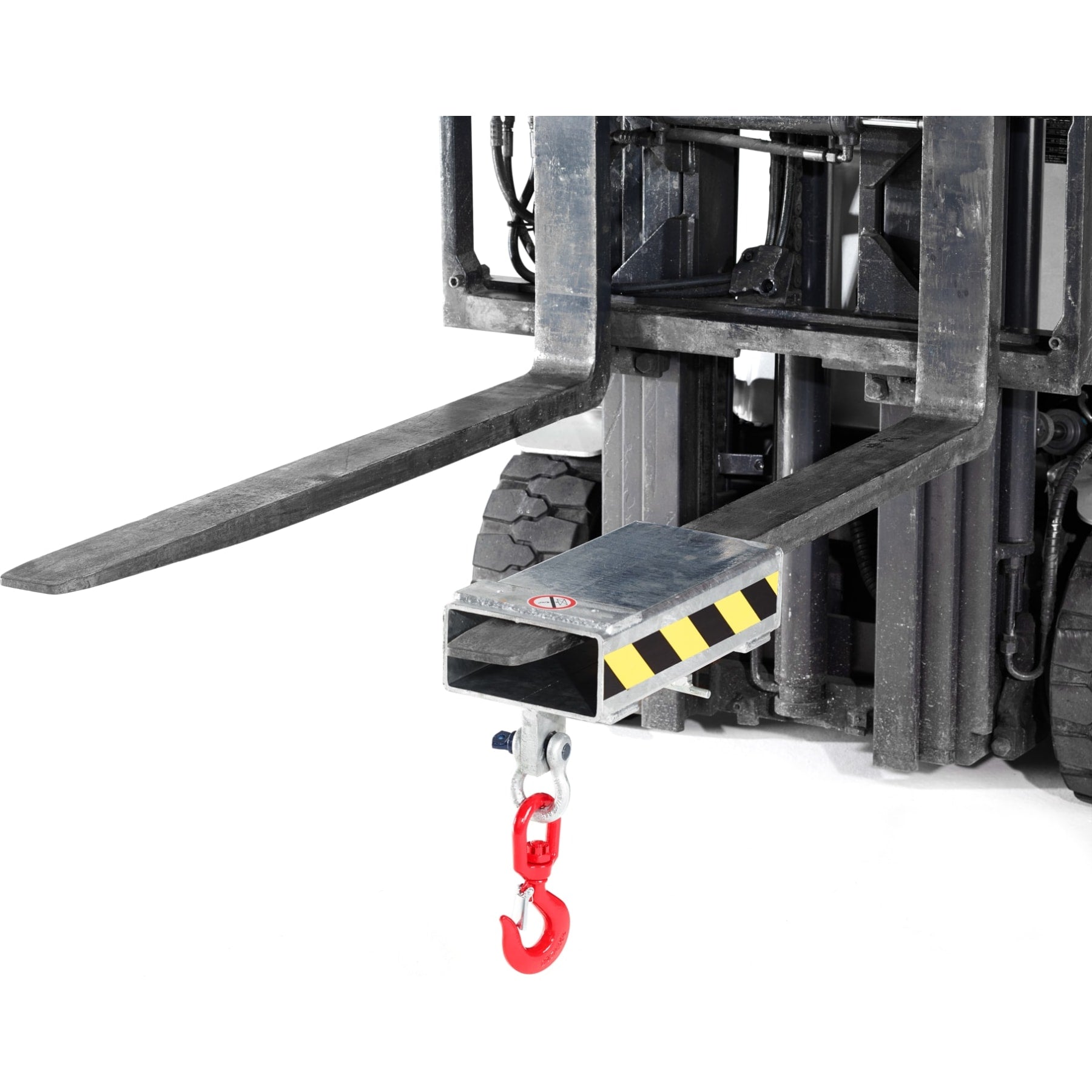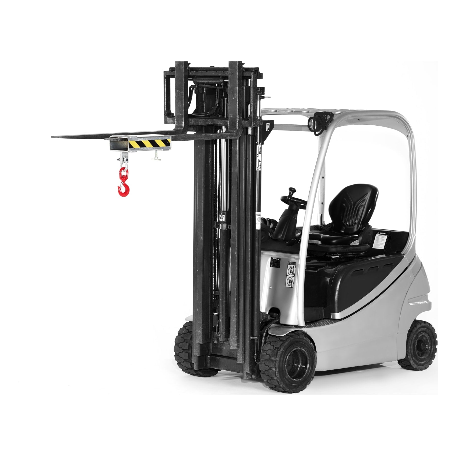 This mobile load hook is attached to a forklift tine and provides a fixed anchor point for lifting and transporting loads.