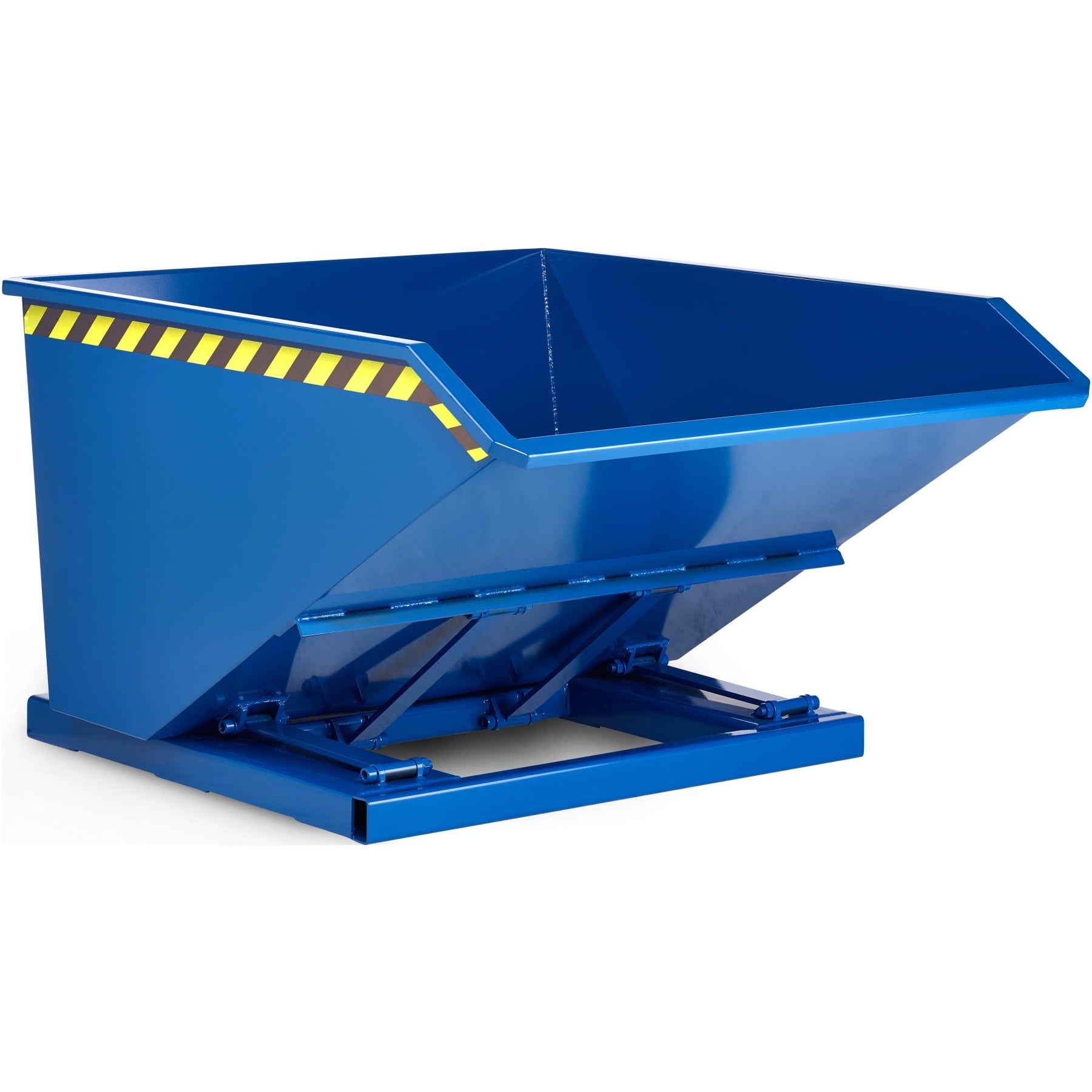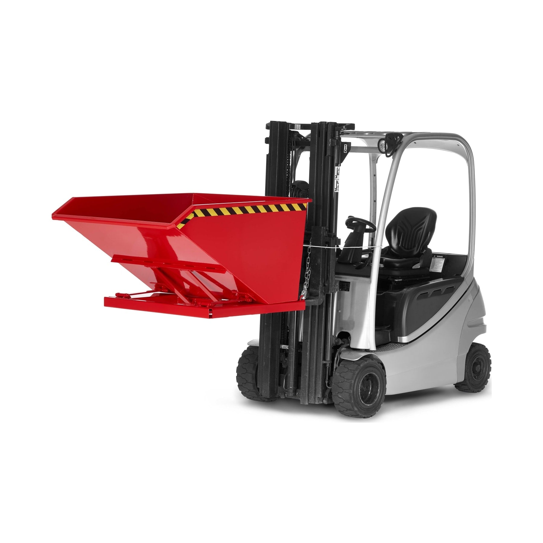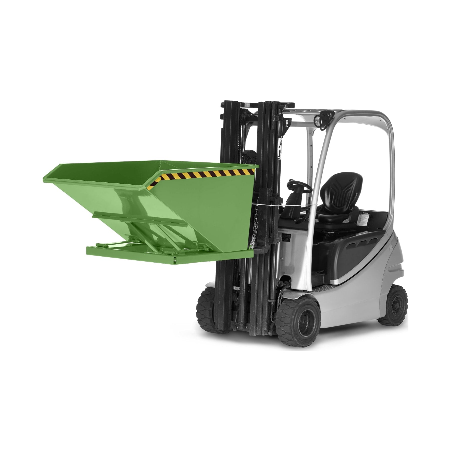 The RTK tipping container is a practical transport container with which all types of goods - preferably bulk goods - can be picked up, collected, disposed of or stored. Thanks to a special scissor mechanism, emptying is possible without damaging the material or the forklift. This is done conveniently and safely using a cable pull from the forklift seat.