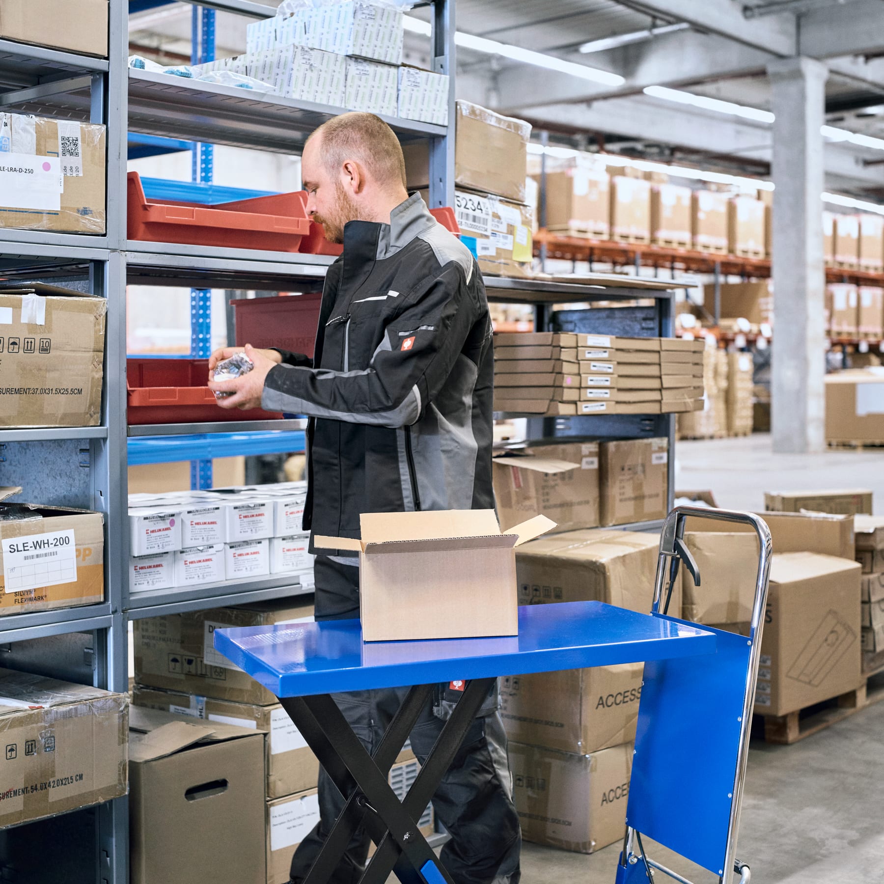 The lifting table trolley X is ideal for lifting work with loose items. It is mobile and designed for transport. In addition, the lifting platform trolley is height-adjustable and can be used as a work table - ideal for ergonomic work during order picking, production and other work in the warehouse.