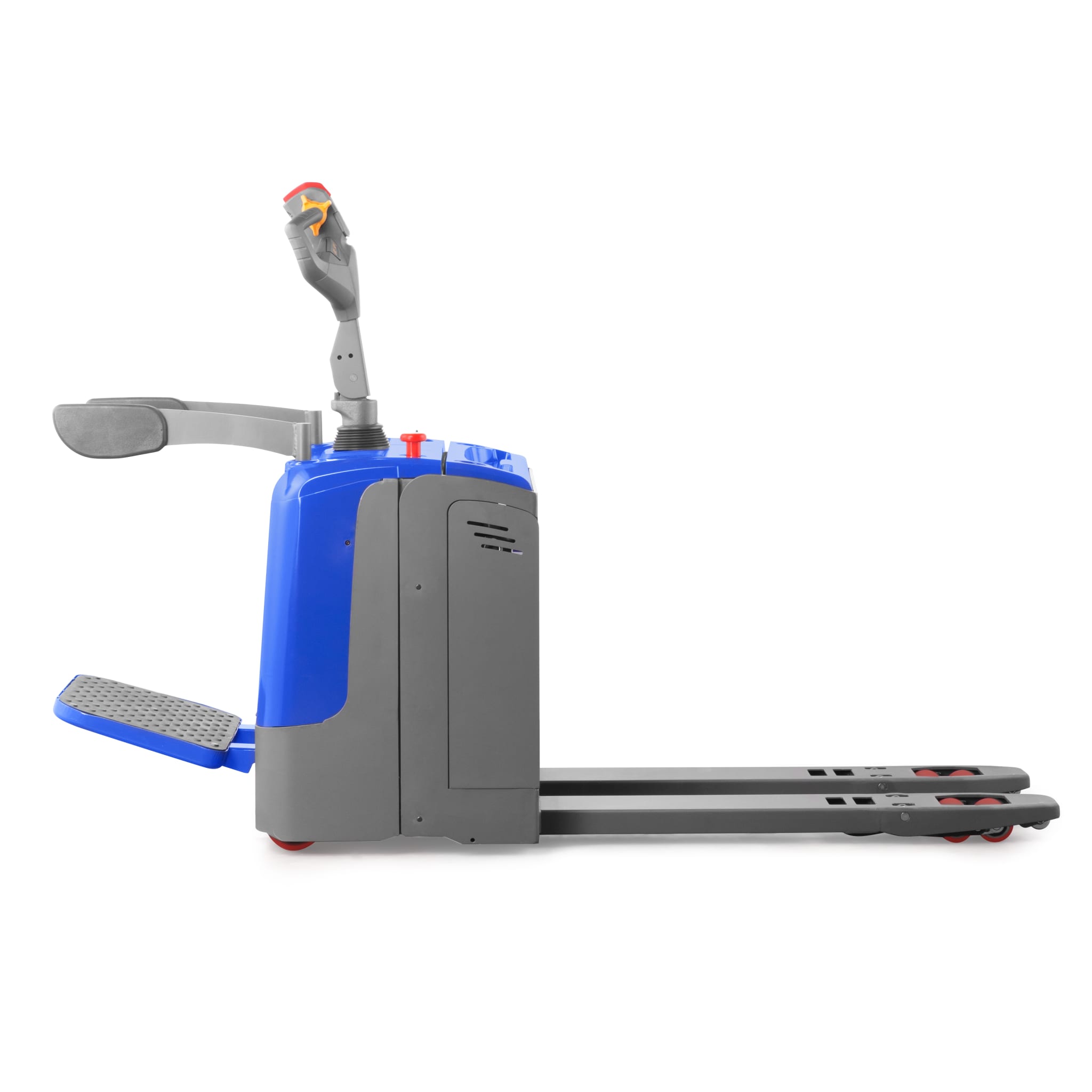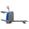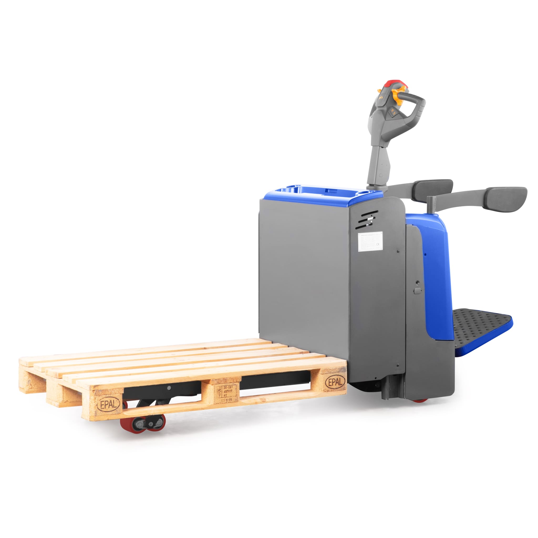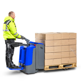 Electric pallet truck RIDE with stand-on platform for energy-saving and efficient manoeuvring and moving of Euro-pallets in warehouse logistics and industrial applications, such as in freight forwarding agencies or large warehouses. The stand-on platform allows the operator to ride on the truck during pallet handling, even over long distances.