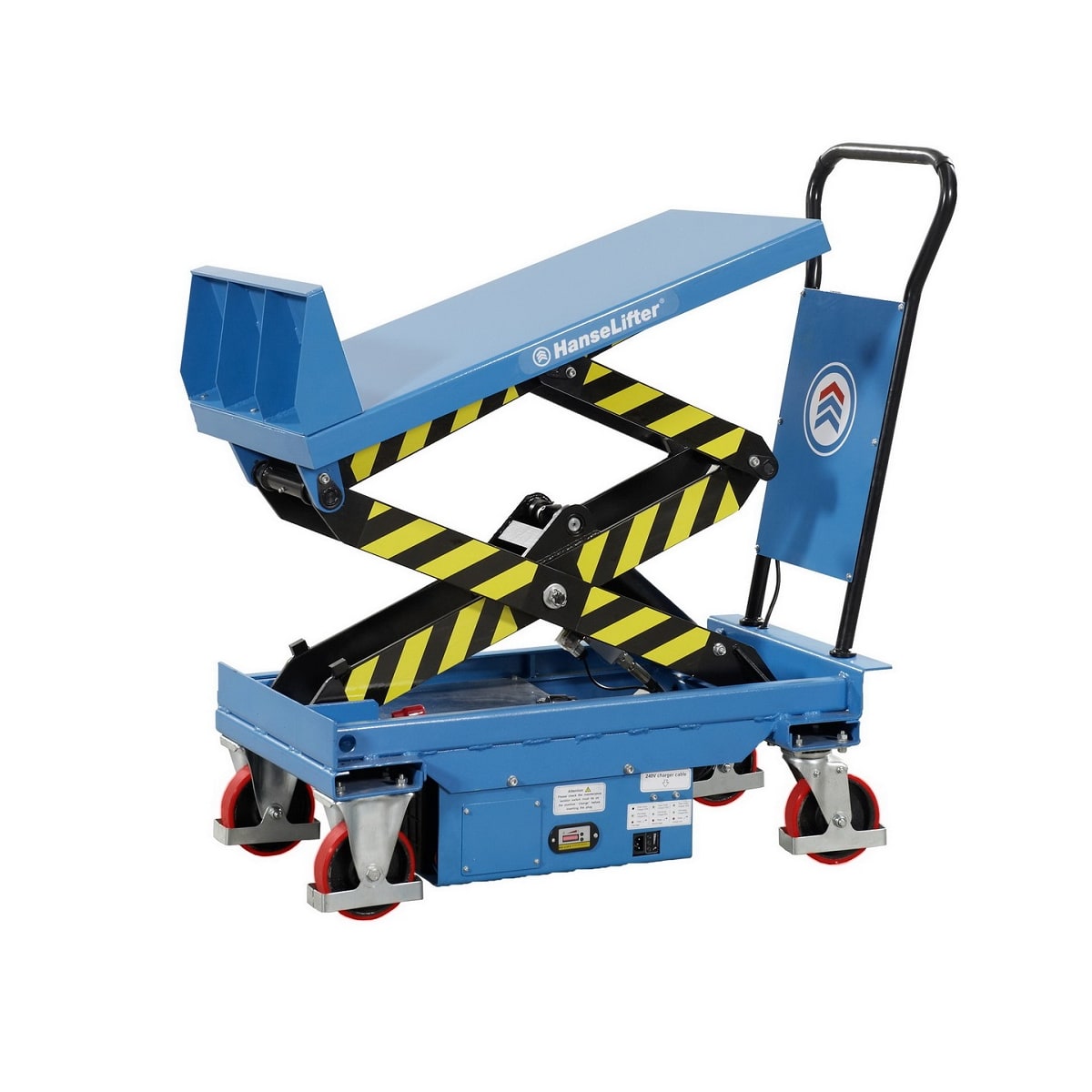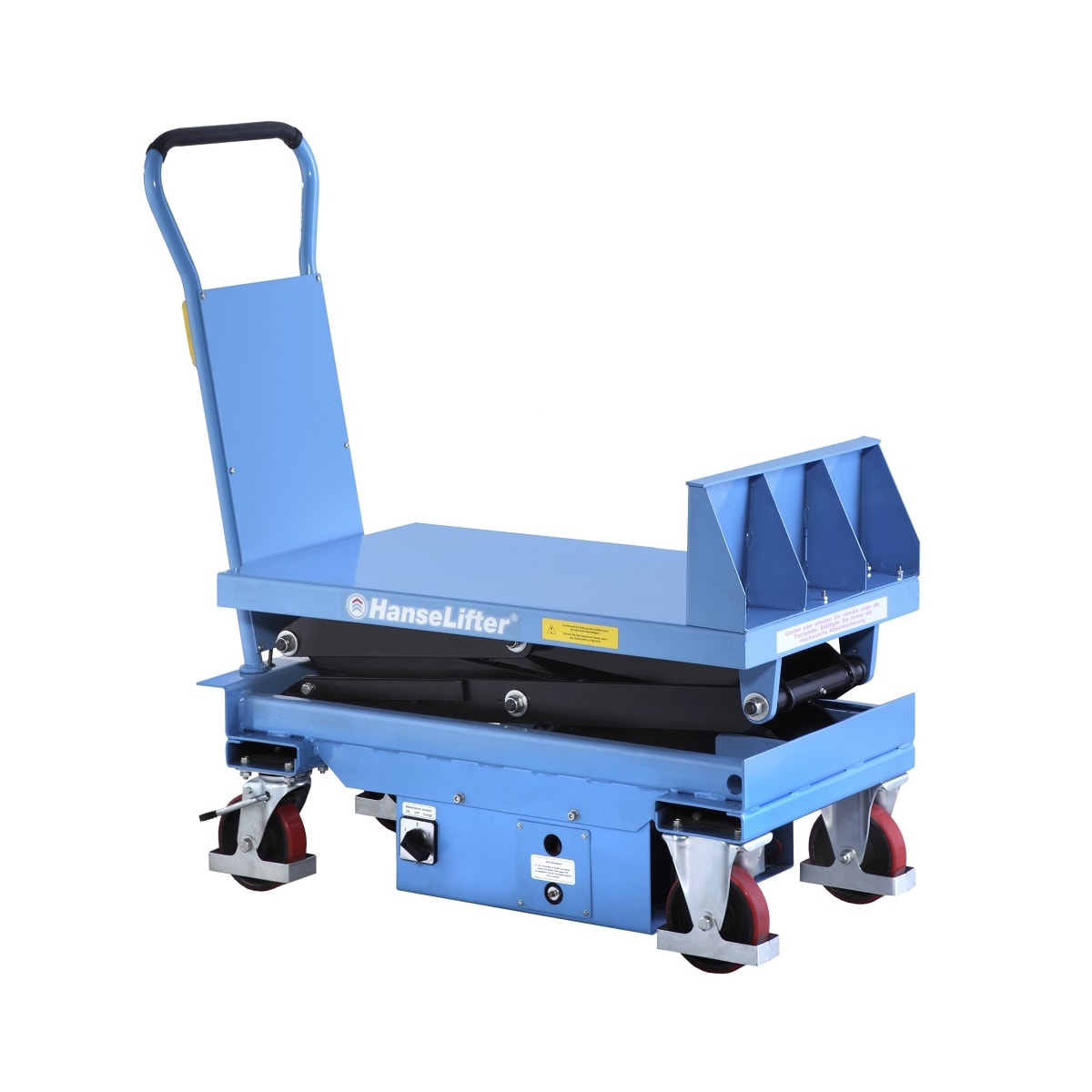 Der elektrische Neigehubtischwagen von Hanselifter ist Arbeitstisch und Transportmittel zugleich. Die Tischplattform kann elektrisch um 45° geneigt und auf 1000 mm stufenlos angehoben werden. Das Heben und das Neigen erfolgen zeitgleich. Das Modell ermöglicht ein ergonomisches Befüllen und/ oder Entleeren von Kisten und Boxen in Produktion und Lager, bei Kommissionier- und Fertigungsarbeiten. Der Antrieb ist manuell
